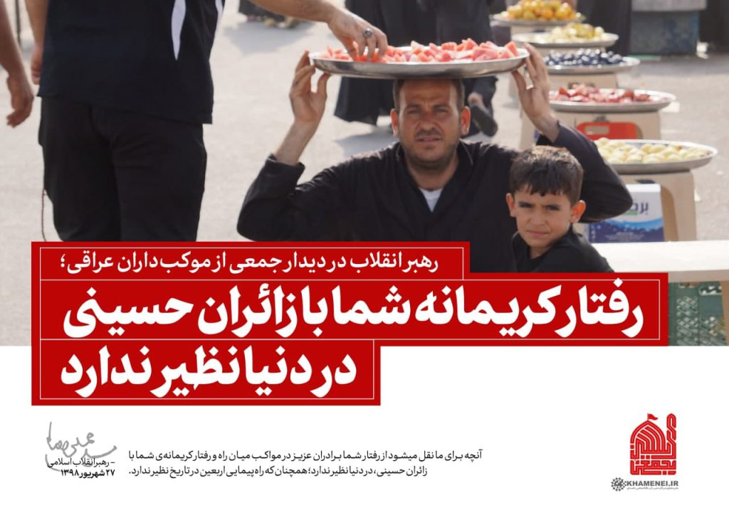 آنچه برای ما نقل میشود از رفتار شما برادران عزیز در مواکب میان راه رفتار کریمانه ی شما با زائران حسینی در دنیا نظیر ندارد همچنان که راه پیمایی اربعین در تاریخ نظیر ندارد.
