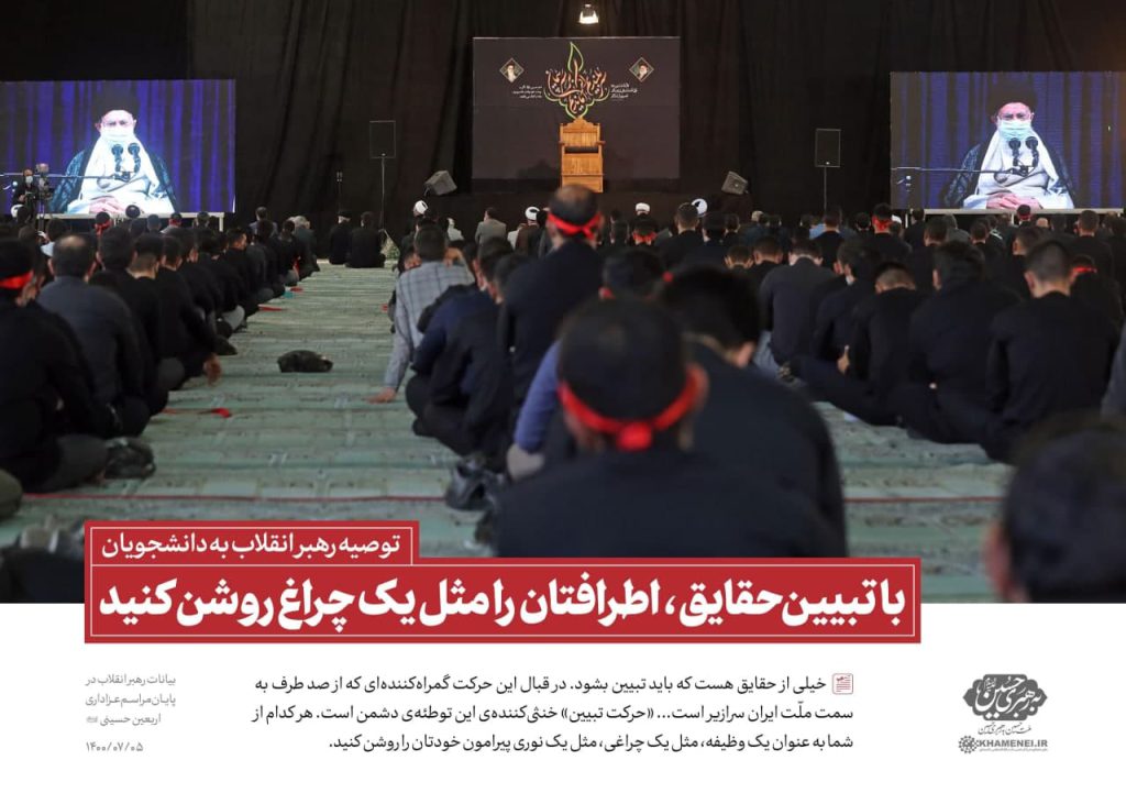 خیلی از حقایق هست که باید تبیین بشود در قبال این حرکت گمراه کننده ای که از صد طرف به سمت ملییت ایران سرایز است …« حرکت تبیین» خنثی کننده این طوطئه دشمن است هر کدام از شما به عنوان یک وظیفه، مثل یک چراغی،مثل یک نوری پیرامون خودتان را روشن کنید.