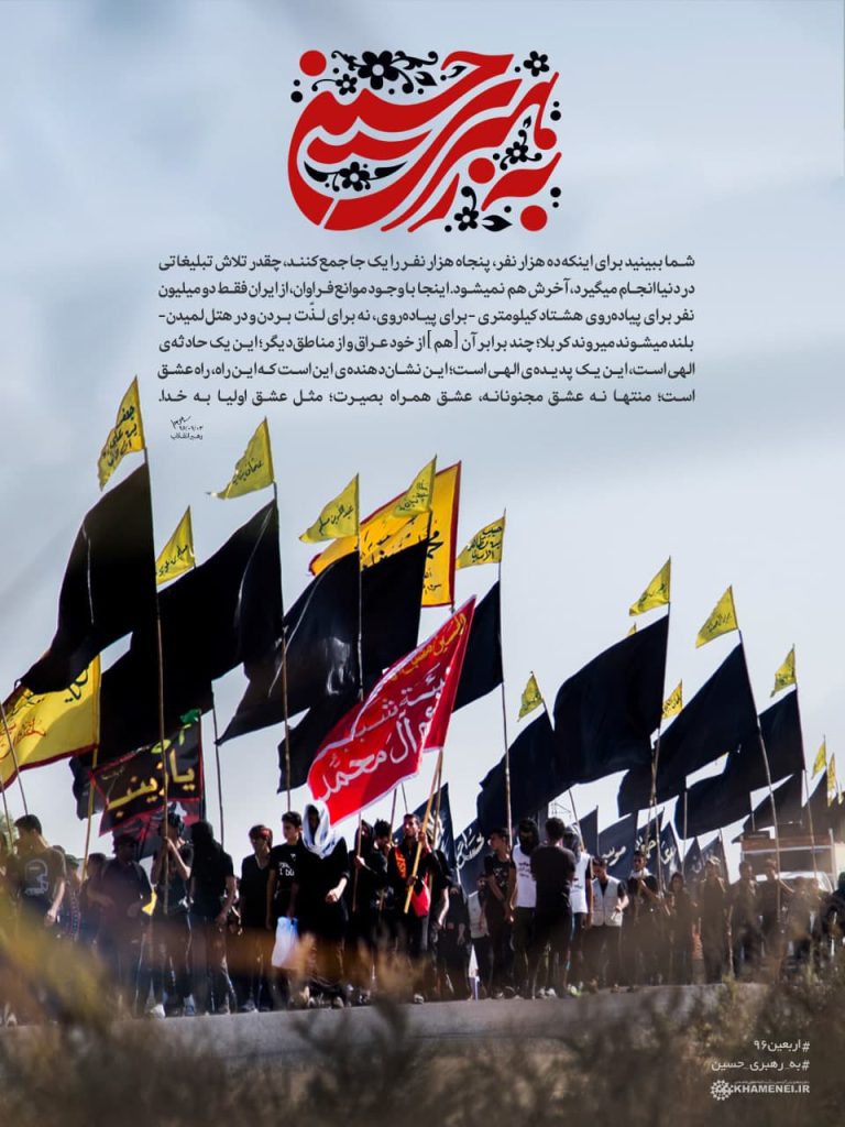 شما ببینید برای اینکه ده هزار نفر، پنجاه هزار نفر را یک جا جمع کنند چقدر تلاش تبلیغاتی در دنیا انجام میگیرد آخرش هم نمی شود اینجا با وجود موانع فراوان از ایران فقط دو میلیون نفر برای پیاده روی هشتاد کیلومتری برای پیاده روی نه برای لذت بردن و در هتل لمیدن بلند میشوند می روند کربلا چند برابر آن (هم) از خود عراق و از مناطق دیگر این یک حادثه ی الهی است این نشان دهنده ی این است که این راه راه عشق است منتها نه عشق مجنونانه عشق همراه بصیرت مثل عشق اولیا به خدا.