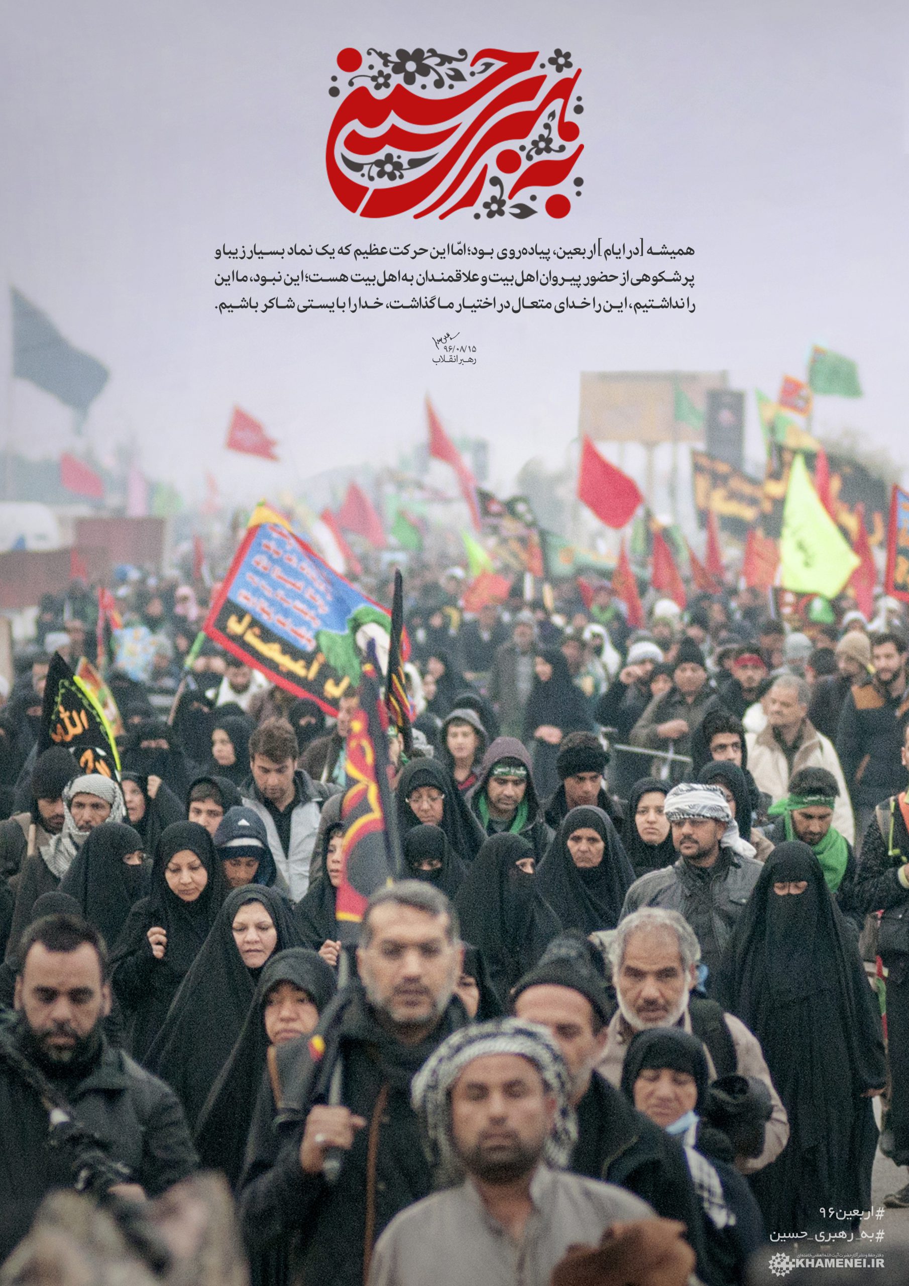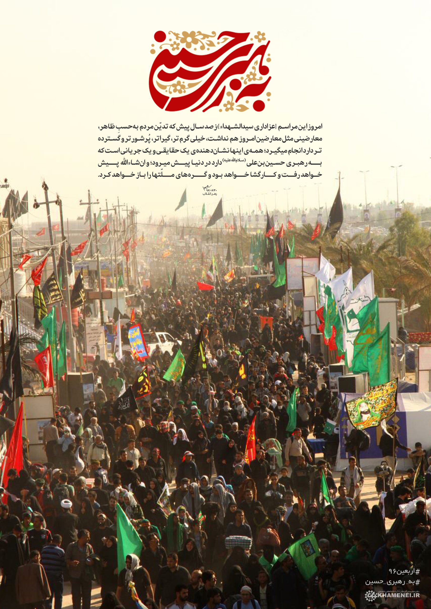شما ببینید برای اینکه ده هزار نفر، پنجاه هزار نفر را یک جا جمع کنند چقدر تلاش تبلیغاتی در دنیا انجام میگیرد آخرش هم نمی شود اینجا با وجود موانع فراوان از ایران فقط دو میلیون نفر برای پیاده روی هشتاد کیلومتری برای پیاده روی نه برای لذت بردن و در هتل لمیدن بلند میشوند می روند کربلا چند برابر آن (هم) از خود عراق و از مناطق دیگر این یک حادثه ی الهی است این نشان دهنده ی این است که این راه راه عشق است منتها نه عشق مجنونانه عشق همراه بصیرت مثل عشق اولیا به خدا.