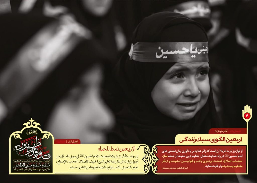 از لوازم زیارت کربلا آن است که زائر علاوه بر یادآوری جان فشانی های امام حسین (ع) در راه خداوند متعال تعالیم دین حنیف از جمله نماز، حجاب، اصلاح، گذشت، بردباری و ادب قوانین آمد و شد و دیگر مفاهیم پسندیده را رعایت نماید.